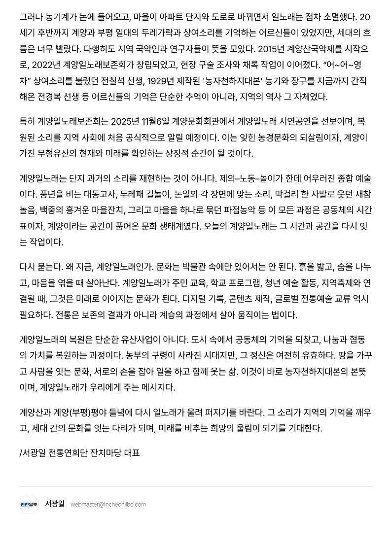 인천일보) [CEO칼럼] 농자천하지대본의 정신을 잇는 계양일노래의 귀환