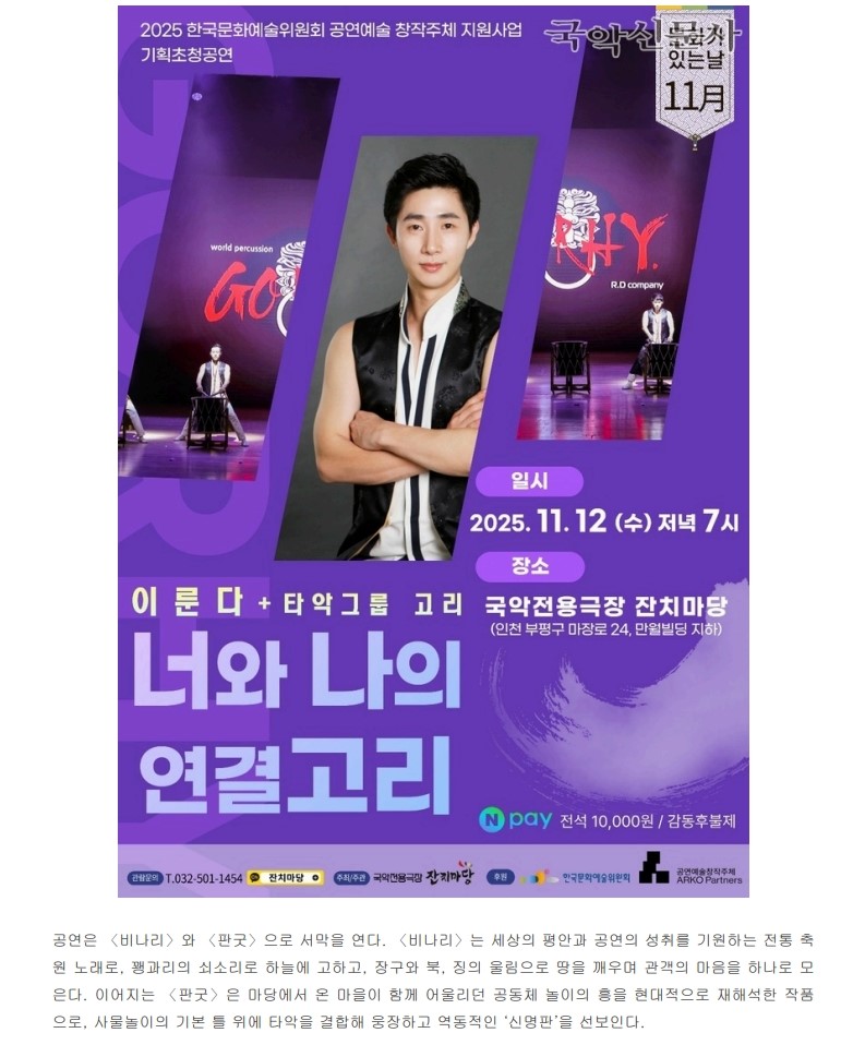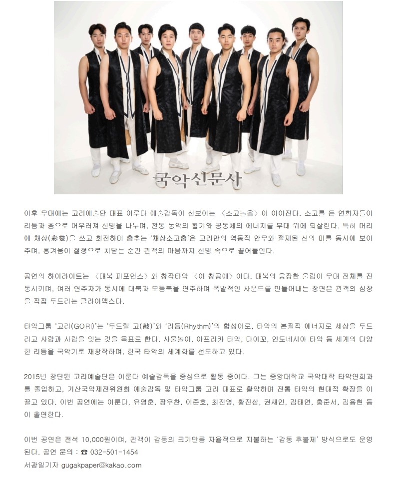 국악신문사) 국악전용극장 잔치마당, 타악그룹 '고리예술단' 초청 공연