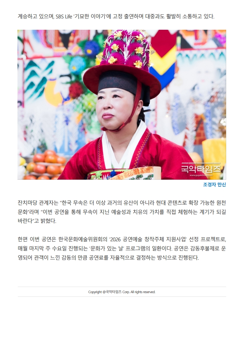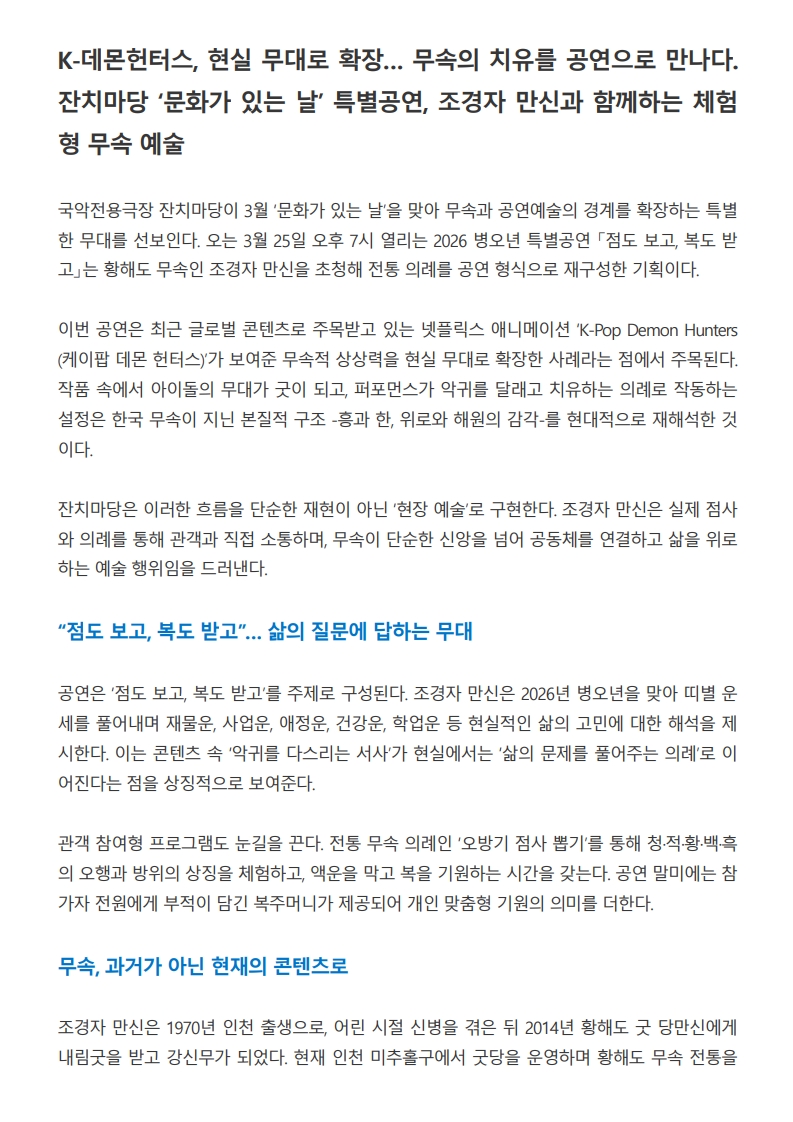 국악타임즈) K-데몬헌터스, 현실 무대로 확장... 무속의 치유를 공연으로 만나다. 잔치마당 '문화가 있는 날' 특별공연, 조경자 만신과 함께하는 체험형 무속 예술