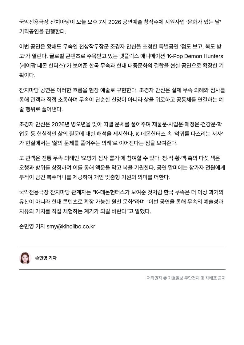 국악타임즈) K-데몬헌터스, 현실 무대로 확장... 무속의 치유를 공연으로 만나다. 잔치마당 '문...