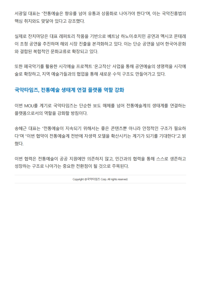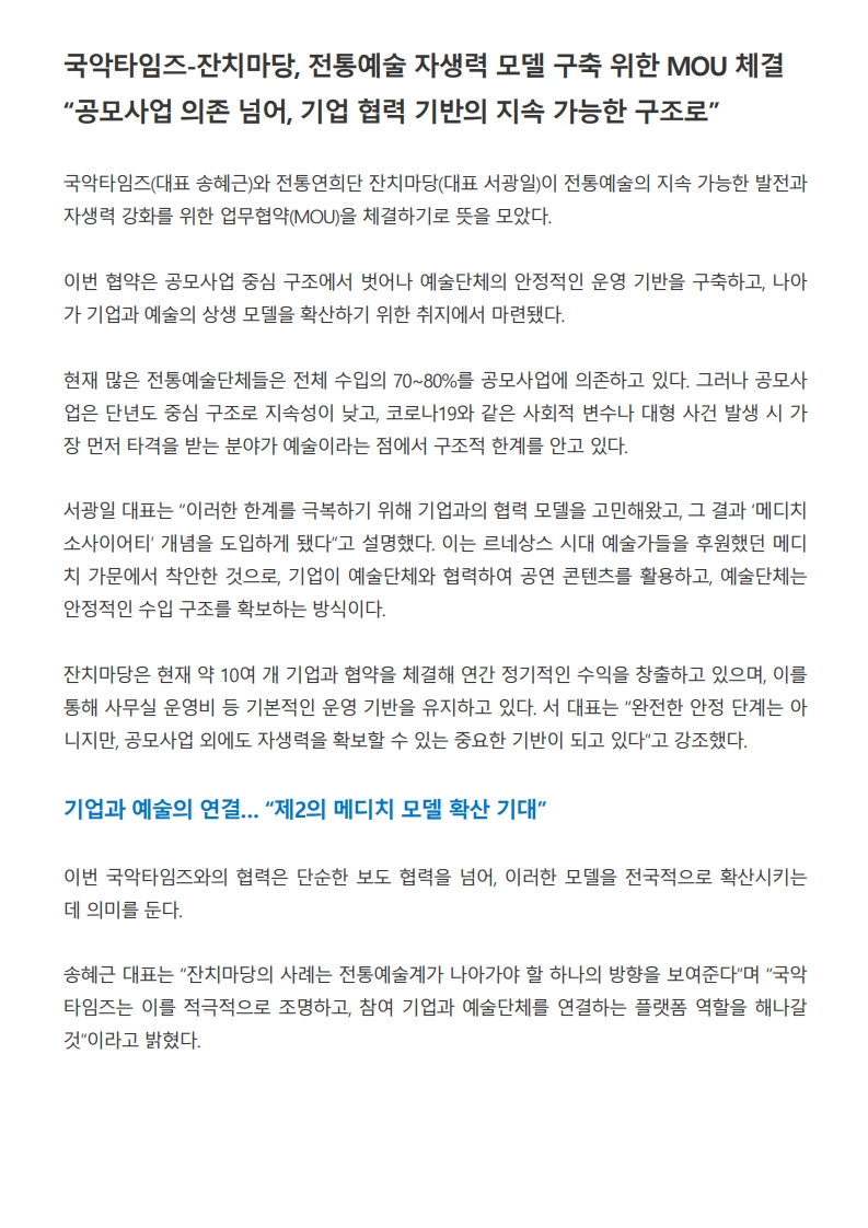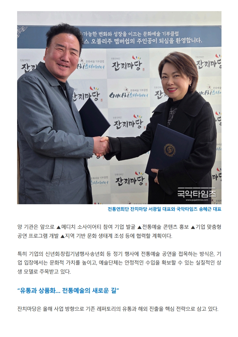 국악타임즈) [MOS체결] 국악타임즈-잔치마당, 전통예술 자생력 모델 구축 위한 MOS 체결 '공모사업 의존 넘어, 기업 협력 기반의 지속 가능한 구조로'