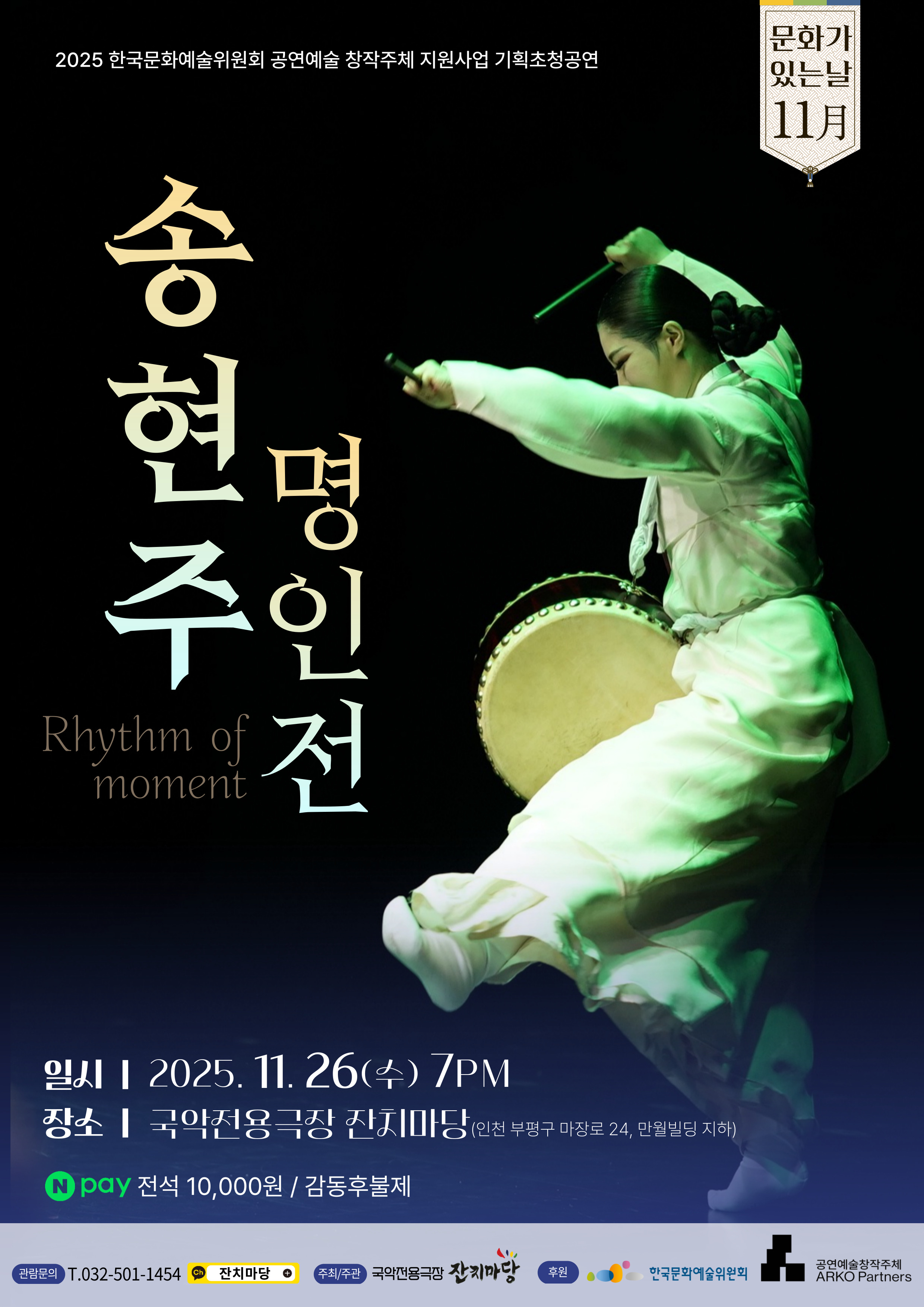 ○ 국악전용극장 잔치마당은 오는 11월 26일(수) 오후 7시, ‘11월 문화가 있는 날’ 기획으로 젊은 춤꾼 송현주 명인전을 선보인다. 이번 공연은 전통춤의 원형과 현대 무용수의 해석이 만나는 특별한 무대로, 평남수건춤, 진도북춤, 설장구, 피리독주, 오북춤 등 우리 전통연희의 미학을 집약한 다섯 작품이 무대에 오른다.