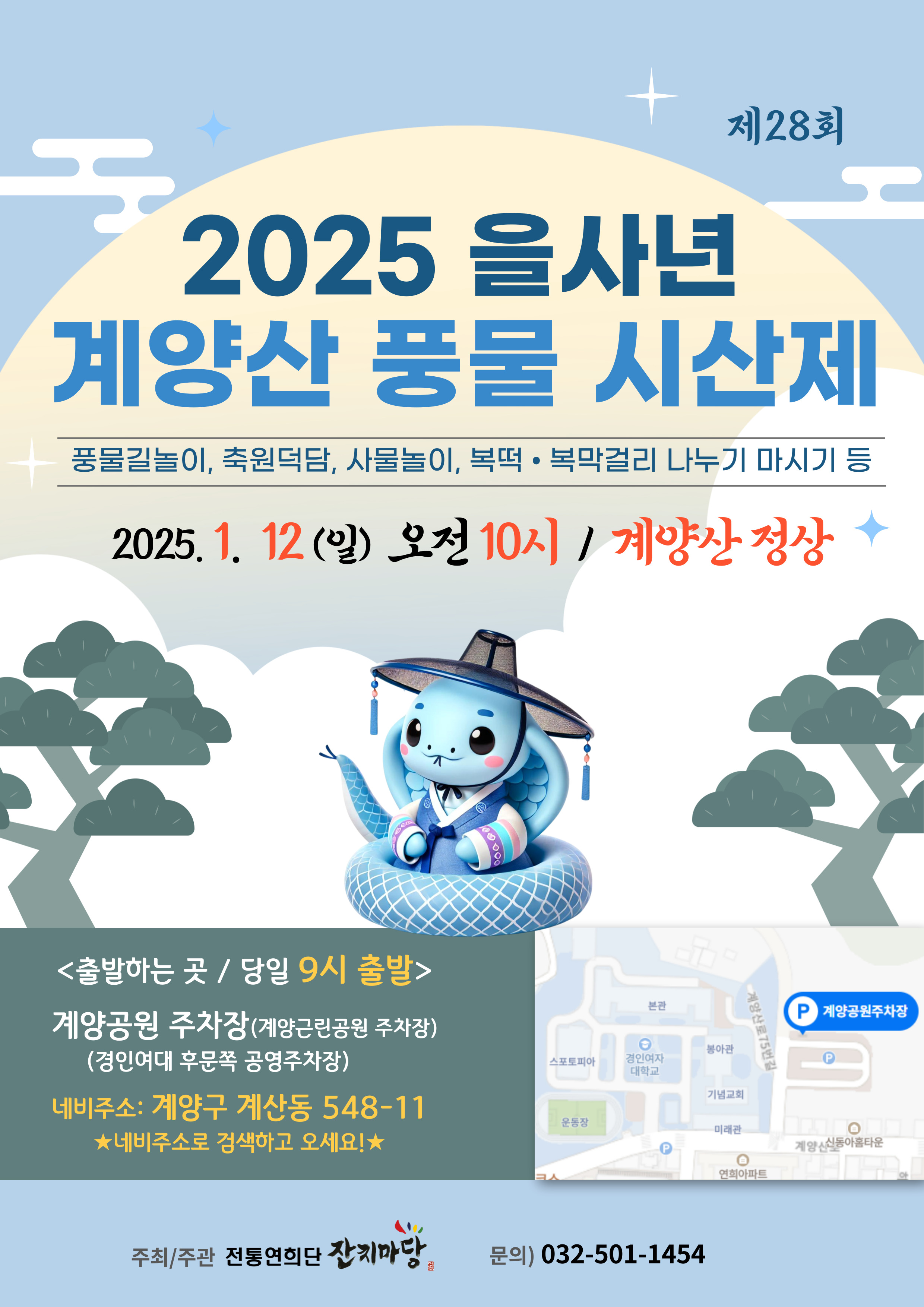 ○ 2025년 을사년 푸른뱀의 해를 맞아, 전통연희단 잔치마당(대표 서광일)은 인천 시민들의 안녕과 발전을 기원하는 제28회 계양산 풍물 시산제를 오는 1월 12일 일요일 오전 10시, 계양산 정상에서 개최한다. 올해 풍물시산제는 ‘쳐드리세! 쳐드리세! 만복을 쳐드리세!’라는 주제로, 시민들의 소망과 축복을 담은 다채로운 프로그램이 펼쳐질 예정이다.