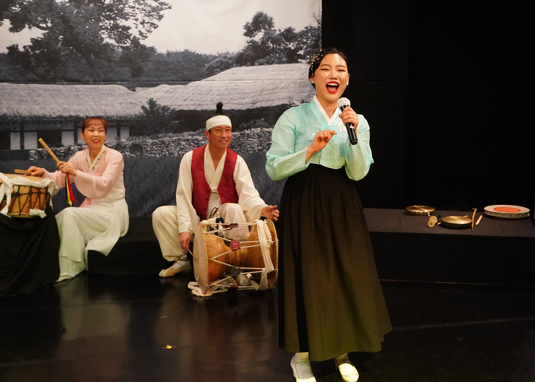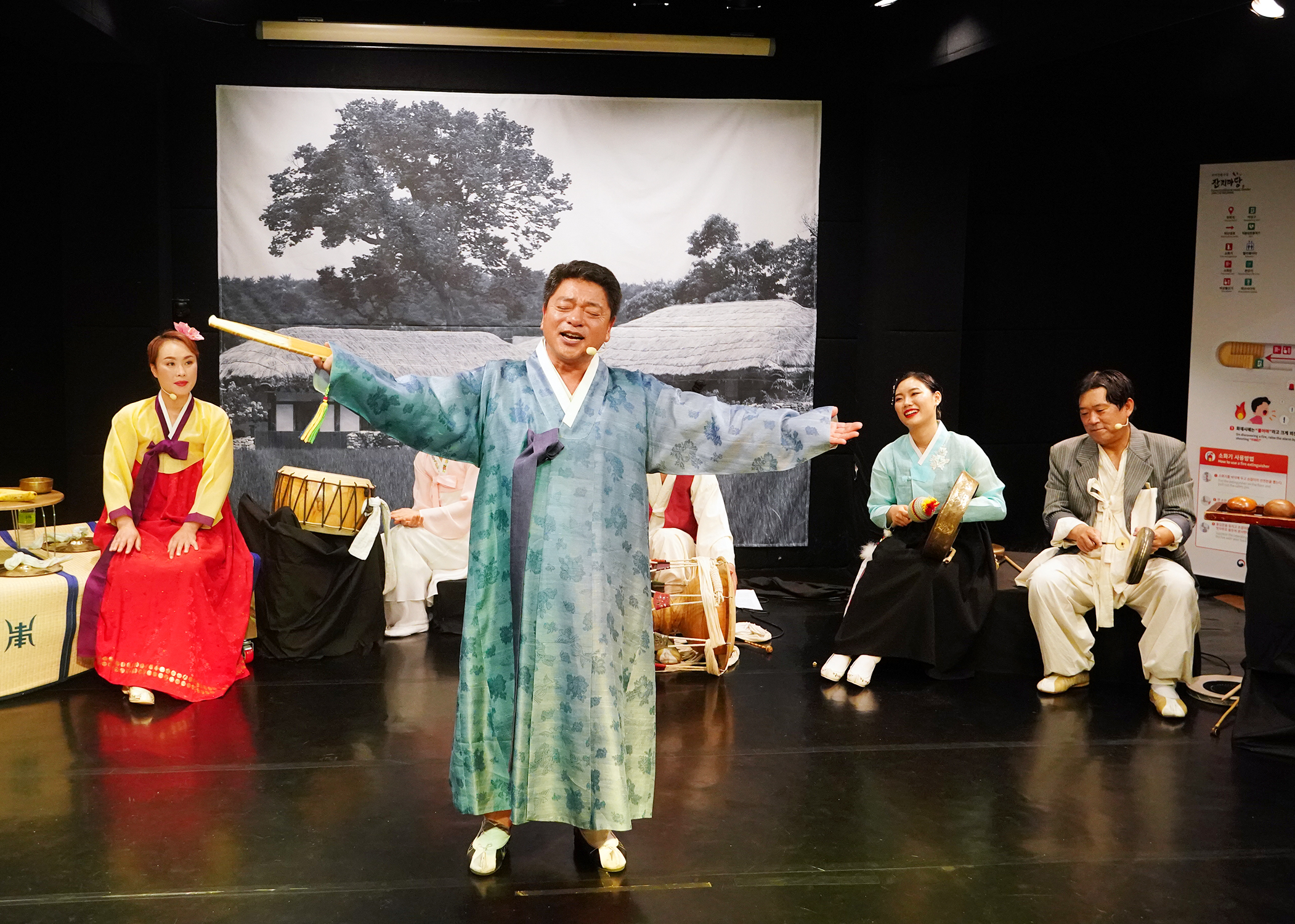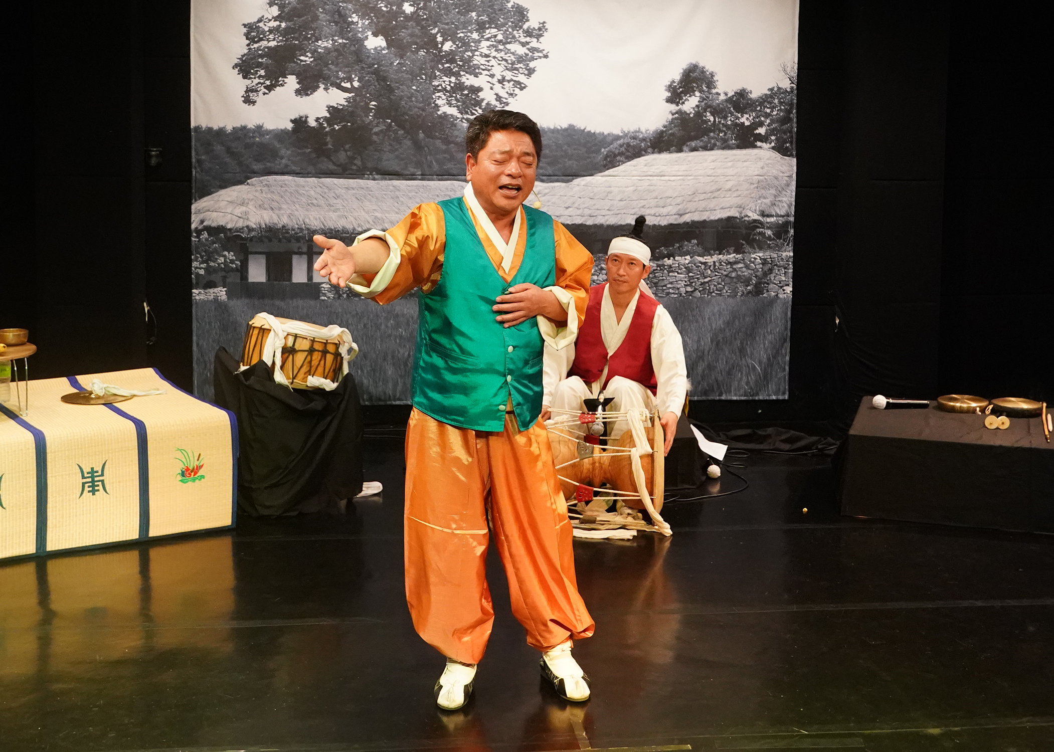 만담꾼의 소리 후, 관객의 노래를 유도하고 관객 한 명 의 노래를 들어본다.